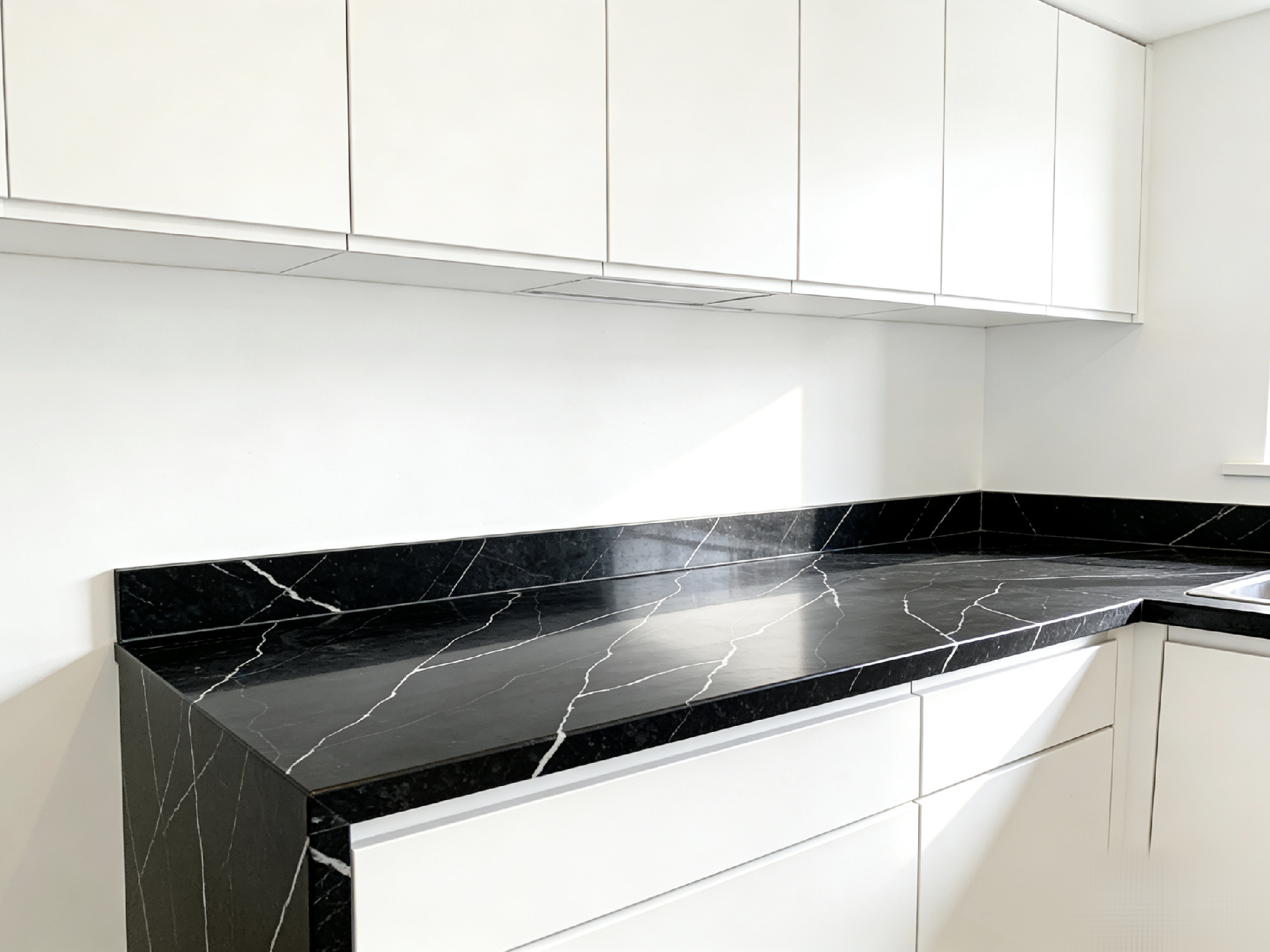 Product Description: QUARTZ SLABS - Neo Black (813-D)This exquisite quartz slab features a deep,pure black backgroundthat serves as a dramatic canvas. Elegantly traversing the surface arecrisp, white linear veins, creating a striking contrast and adding a sense of dynamic movement