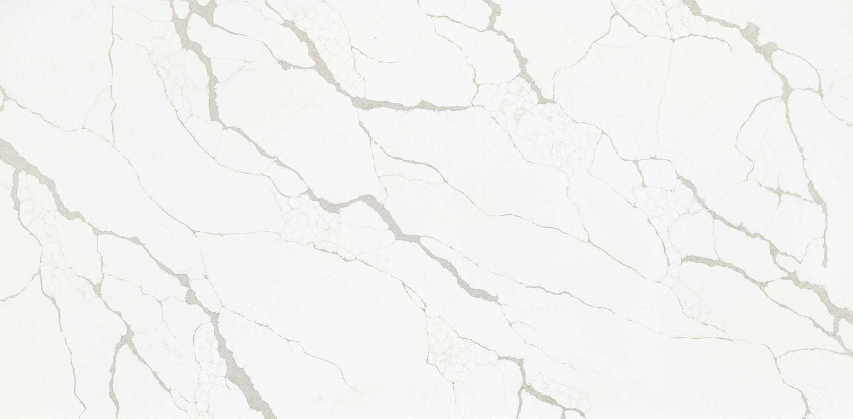 This classic Calacatta-style quartz slab features a pure white background, elegantly combined with soft, flowing veining in light taupe-gray. The subtle yet distinct veining creates a natural marble-like aesthetic, while delicate web-like micro-veining adds depth and texture across the surface. The overall design balances sophistication and versatility, making it ideal for both modern and traditional interiors.