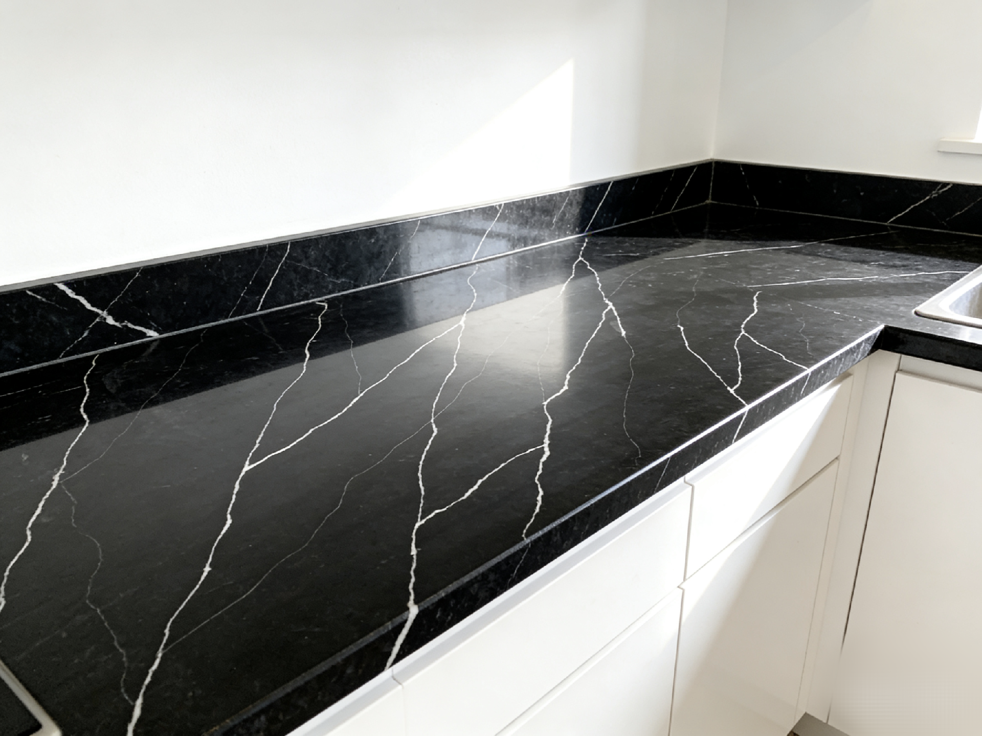 Product Description: QUARTZ SLABS - Neo Black (813-D)This exquisite quartz slab features a deep,pure black backgroundthat serves as a dramatic canvas. Elegantly traversing the surface arecrisp, white linear veins, creating a striking contrast and adding a sense of dynamic movement